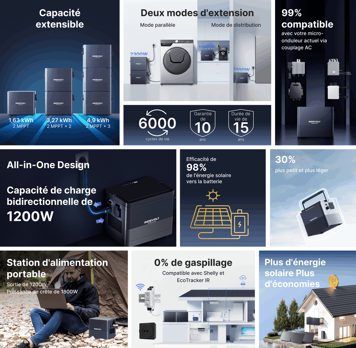 - Charge bidirectionnelle: Profitez des heures creuses pour charger à partir du réseau électrique ou assurez une alimentation de secours en cas de peu de soleil.