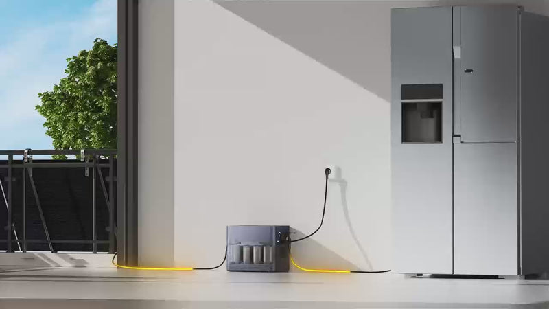 Grâce à la connexion par câble, plusieurs BK1600 Ultra peuvent faire fonctionner des appareils électroménagers puissants. Par exemple, une machine à laver de 2000 watts, qui ne peut pas être alimentée par un seul BK1600 Ultra avec une puissance nominale de 1200 W, peut être prise en charge en mode parallèle. Dans ce cas, la puissance de la machine à laver est répartie équitablement entre chaque appareil, de sorte que chaque Ultra n'a besoin que de 1000 W pour démarrer la machine à laver sans problème. Ainsi, la capacité de la batterie est utilisée de manière optimale, sans avoir à puiser d'électricité dans le réseau.